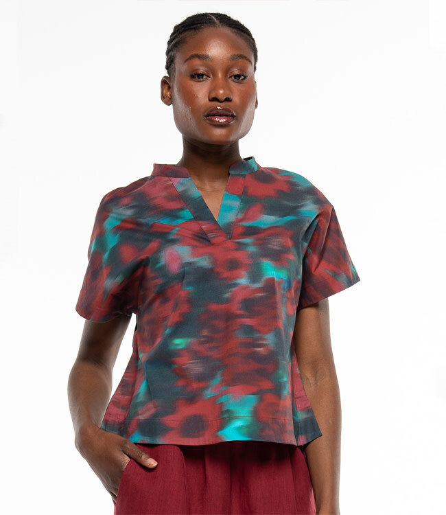 Deze blouse is gemaakt van biologisch katoen popeline met een klein beetje elastaan. Biologisch katoen voelt vaak gewoon prettiger aan op de huid, en dat merk je hier ook. De stof is glad, huidvriendelijk en sterk. Wel een belangrijke tip bij zo’n mooie print: was zo min mogelijk. Vaak is luchten al genoeg, en zo blijft de print ook langer mooi. Minder wassen is niet alleen fijner voor je kleding, maar ook gewoon beter voor het milieu.