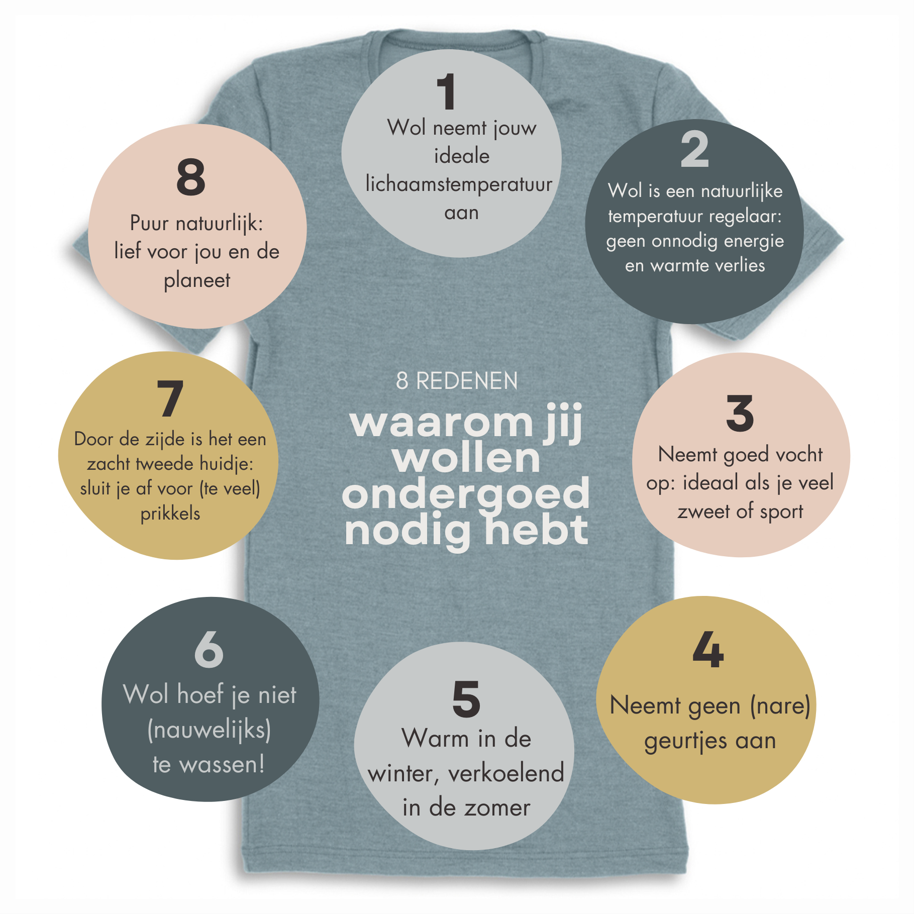 Wolvezels kunnen namelijk tot een derde van hun gewicht aan vocht opnemen zonder dat het nat aanvoelt. Dat betekent: jij blijft droog, je laken blijft droog, en je wordt niet half verkleumd wakker zodra je afkoelt. Wol is bijvoorbeeld ook ideaal voor sporters, warmbloedige mensen, dames in de overgang en eigenlijk iedereen die het snel heet heeft. Wollen nachtkleding of ondergoed helpt je lichaam z’n eigen temperatuur te reguleren dat kunnen synthetische stoffen écht niet. En die gaan, in tegenstelling tot wol, nog stinken ook!