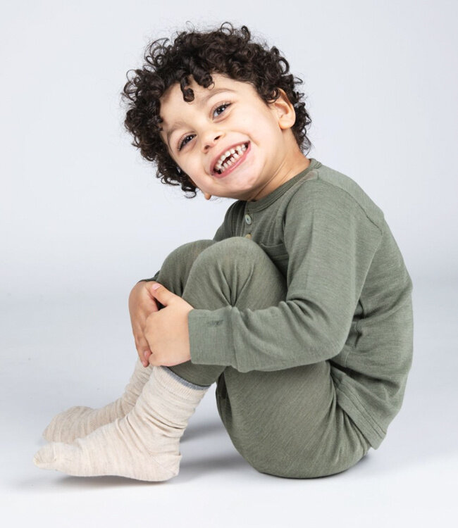 De wol zorgt voor warmte als het koud is en verkoeling als het warm is, terwijl zijde zorgt voor zachtheid op de huid. Wol-zijde ademt echt – dus geen klam gevoel na een middag buiten spelen of sporten. En doordat de legging lang valt, blijven ook lange benen goed bedekt.