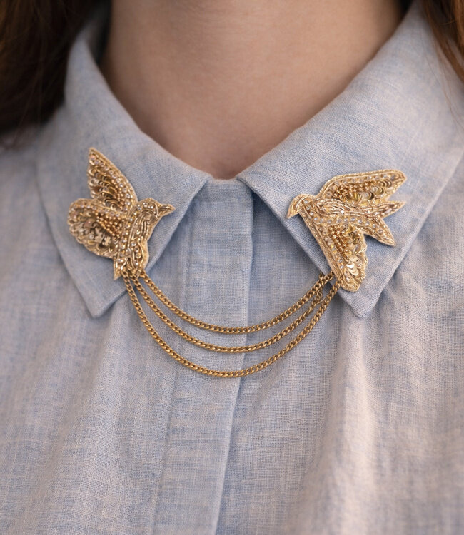 Deze broche is niet zomaar een accessoire. Het zijn twee sierlijke duifjes die samen verbonden zijn met fijne kettinkjes – een detail dat meteen beweging en elegantie toevoegt aan je look.