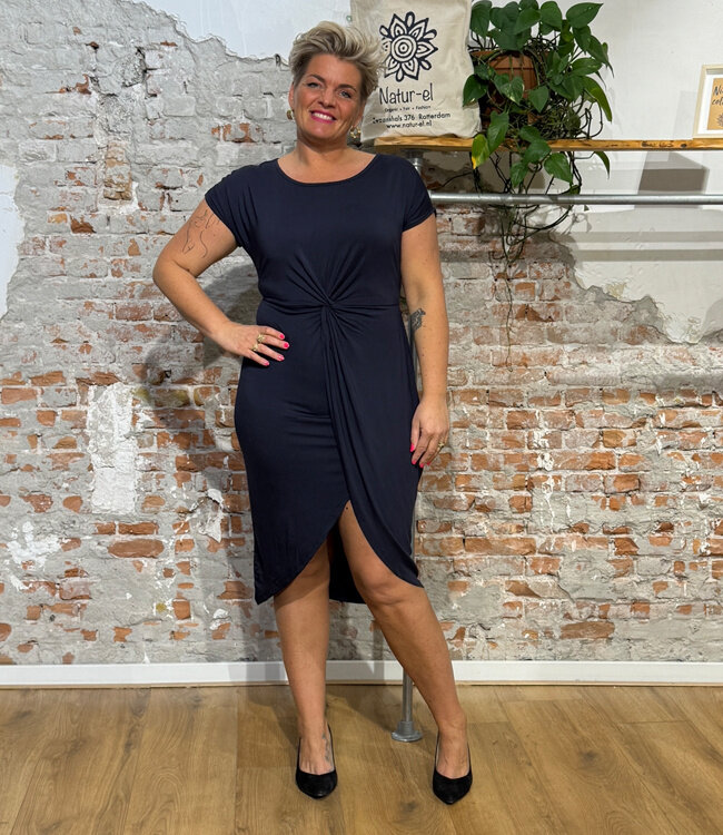 De knoop in de taille zorgt voor een prachtige, flatterende plooival. Hij camoufleert waar je wilt en accentueert waar je trots op bent. De overslag aan de voorkant geeft beweging en een tikje speelsheid. Dit is zo’n jurk die je draagt naar een feestje, een diner of een bruiloft, maar ook gewoon naar je werk met een sneaker eronder.