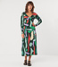 Het model is een midi met een a-lijn: boven aangesloten, onder wat losser. En die v-hals met geknoopt effect maakt het nét wat bijzonderder. Elegant zonder poespas. De print is lekker uitgesproken met groentinten, rood, lila en crème. Heb je al gezien dat we ook een shirt hebben met deze print? Just saying…