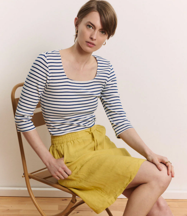 LOLLY heeft een aangesloten fit. Draag je ‘m graag iets losser? Neem dan een maatje groter. Hij is prachtig op een high waist jeans, onder een tuinbroek of gecombineerd met een zwierige rok voor dat Franse-streepjesgevoel.