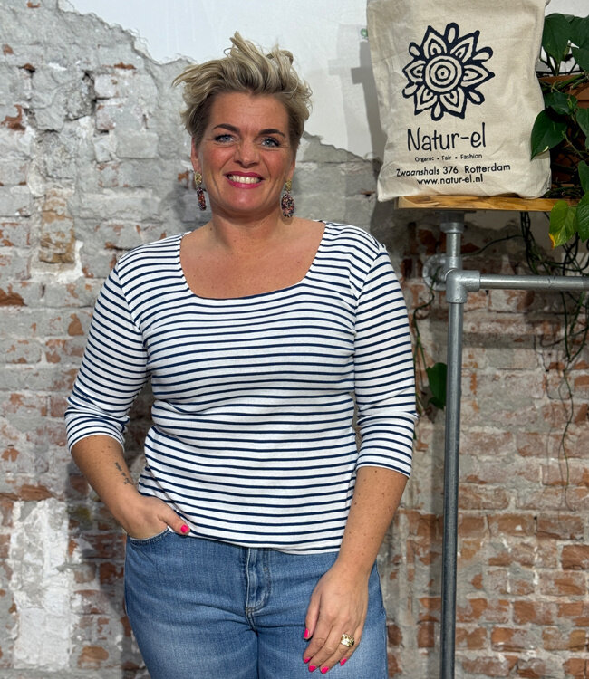 De strepen zijn garengeverfd, wat betekent dat de kleuren dieper en mooier blijven. Je ziet en voelt dat dit geen “zomaar” shirt is. Dit is kwaliteit waar je blij van wordt.