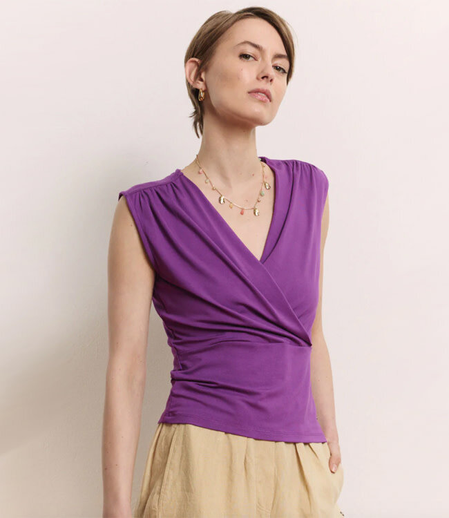 Soms trek je iets aan en denk je: hallo taille, hallo zelfvertrouwen. Dat is JANE. Een overslagtop in die geweldige grape kleur waar je huid spontaan van gaat stralen. Zacht, soepel en met precies genoeg pit om je outfit interessant te maken, zonder dat je overdressed bent.