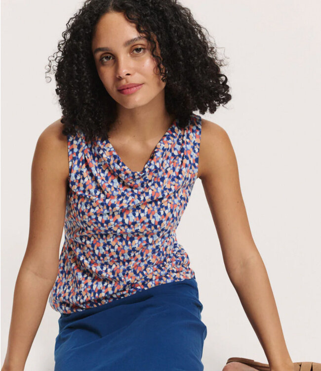 De print is speels en zomers, maar niet schreeuwerig. Echt zo’n print waarvan klanten in de winkel zeggen: “Oeh, deze is leuk! Maar kan ik ’m ook netjes dragen?” Ja dus. Met een mooie rok, onder een blazer, of gewoon op je favoriete jeans. Dit is zo’n top die meebeweegt met jouw dag.